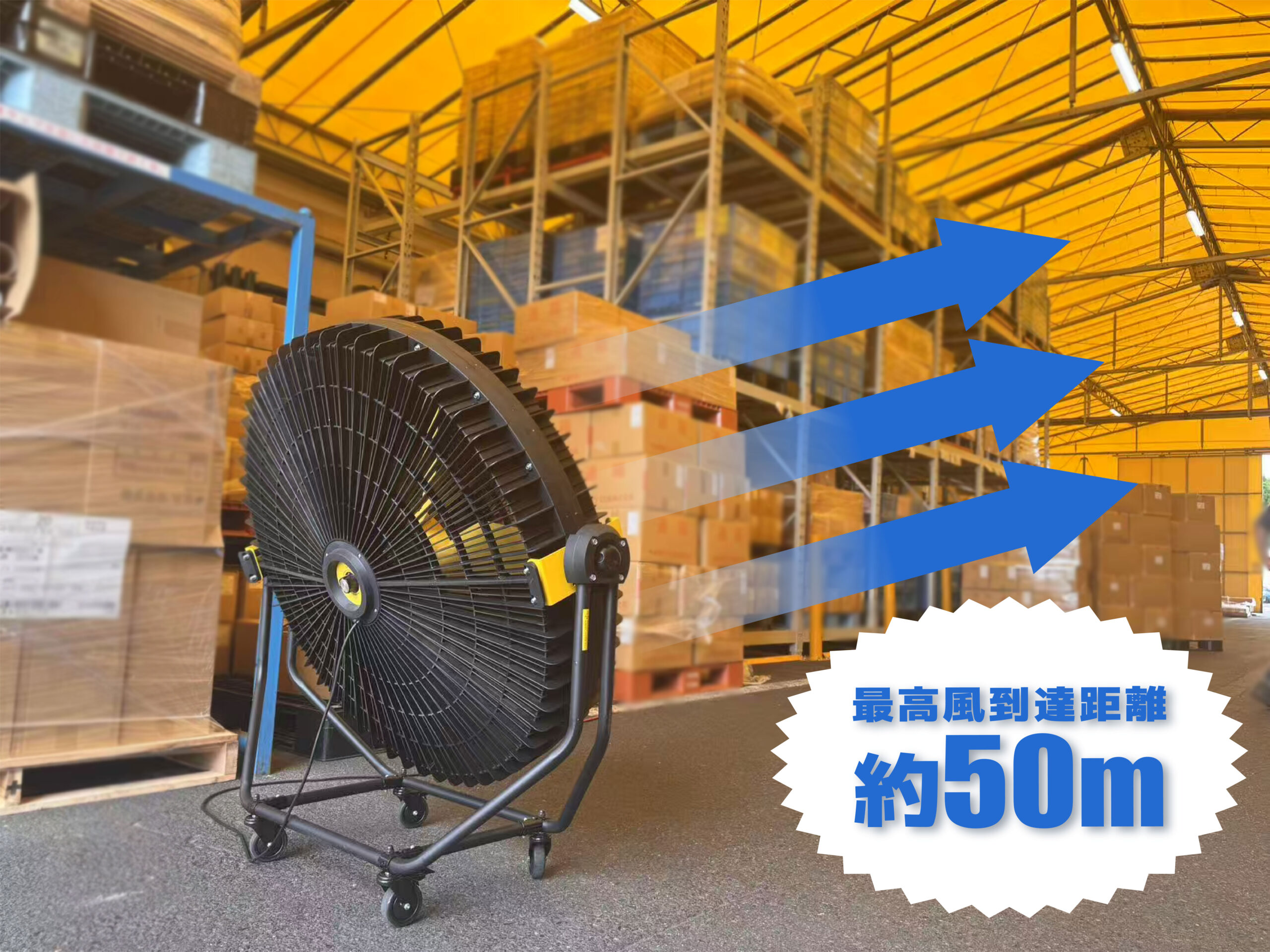 コンパクトなサイズからは想像できないほどの強力な送風能力を誇ります。最大運転時には、約50m先まで風を送ることができ、広範囲の熱気を効率的に移動させ、快適な作業環境の実現をサポートします。空調やスポットクーラーとの併用で効率UPにも活用できます。